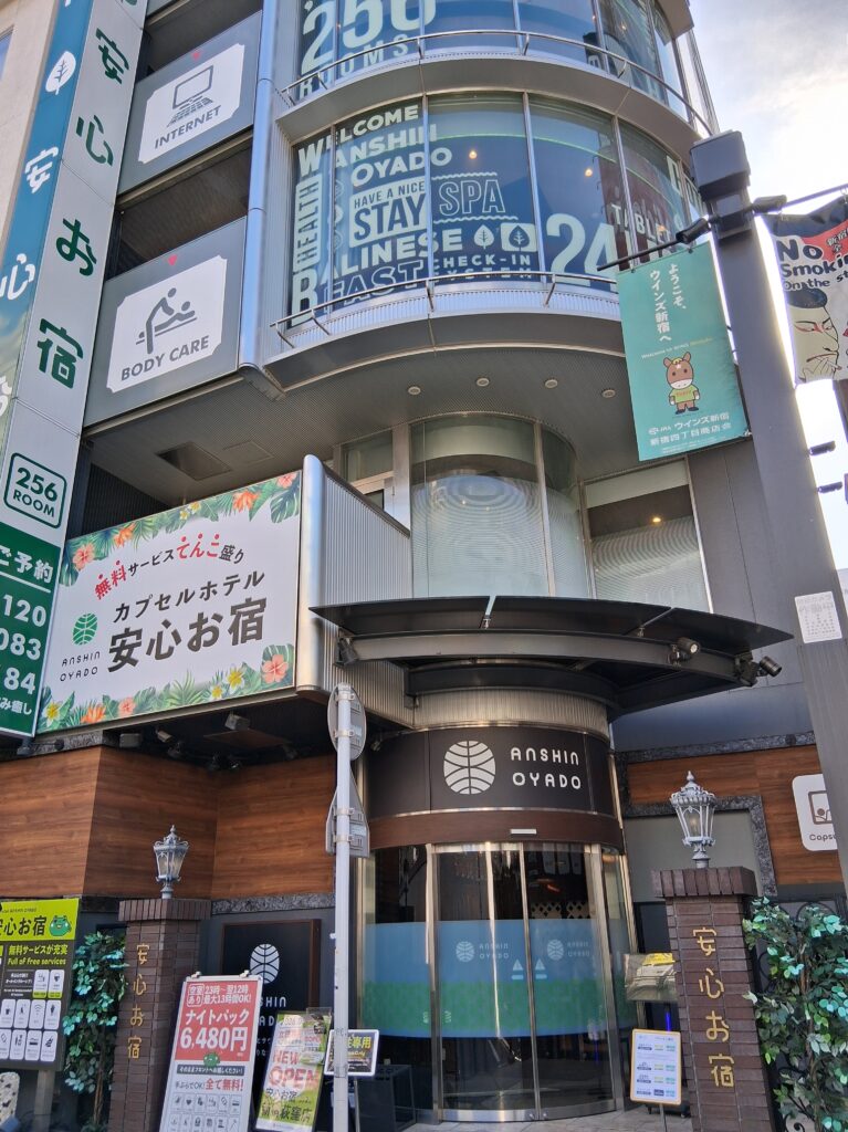 「安心・お宿」はたぶん駅から5~10分程度で行けるのではないか。ホテルというより、細長いビルになっている。駅近だから、コンビニ、マック、食堂、ドンキ、デパートなんでもそろっている。