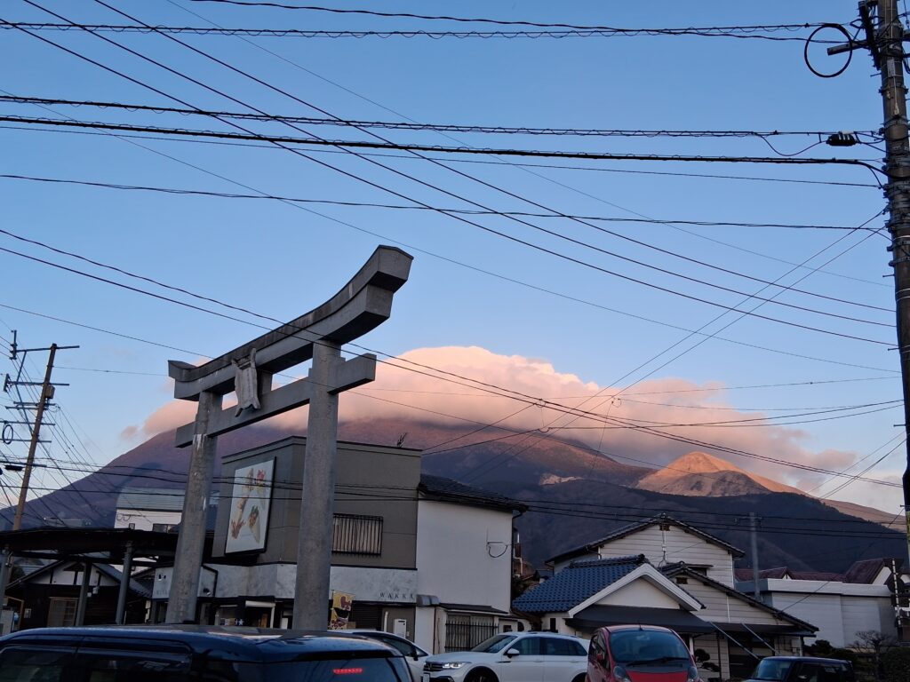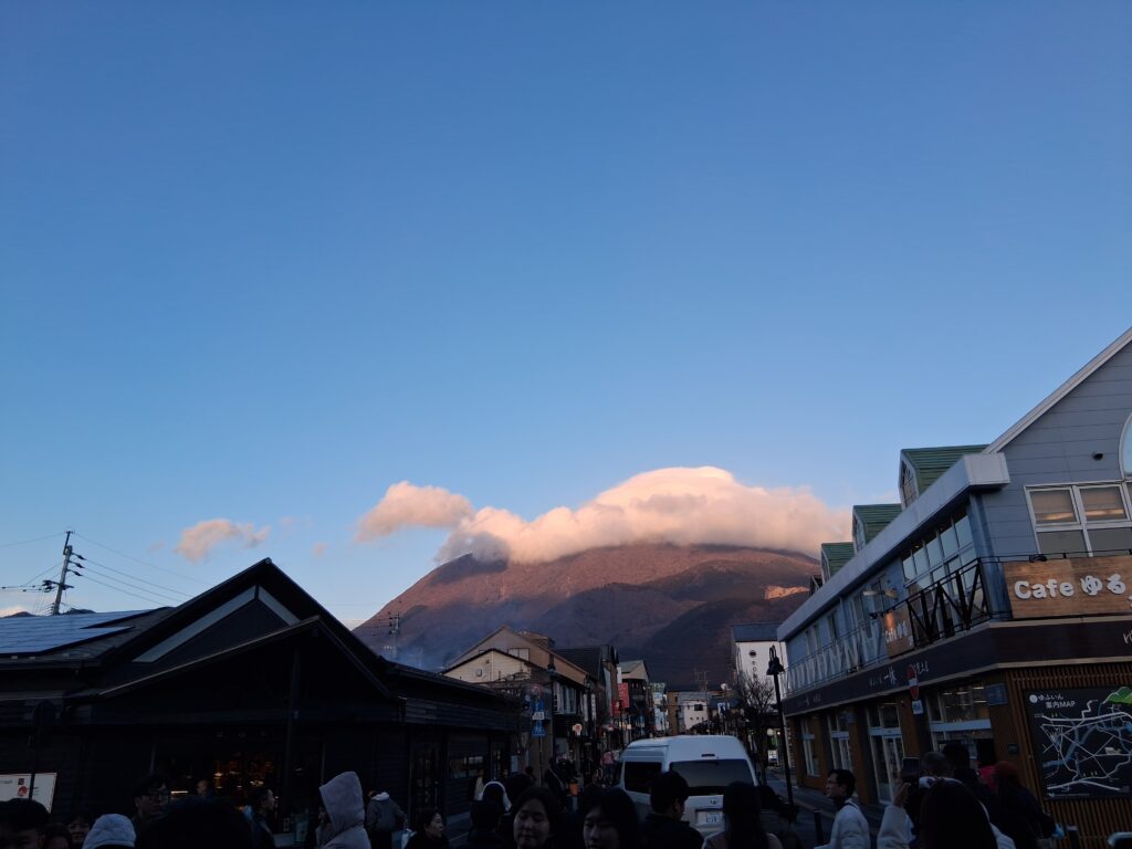 駅から見える景色に圧巻。湯布院岳に丸い雲がかかっている。