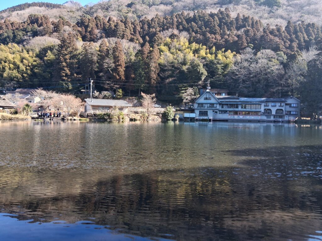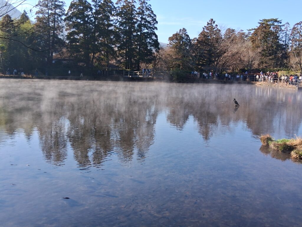 さてまず到着したのは金鱗(きんりん)湖。ここ金鱗湖は温泉水と清水が混ざる湖のため水温が高く、秋〜冬の早朝に湖面から霧が立つ。ちょうど我々もこの朝霧をみることができた。