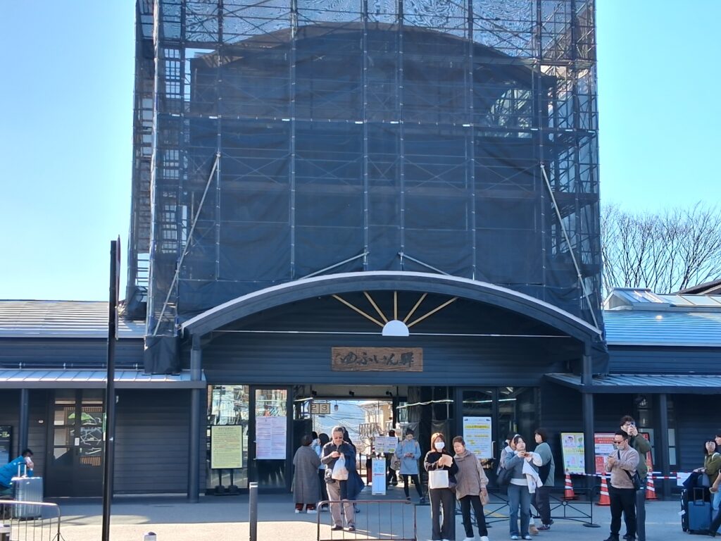 湯布院駅。その時は内装の工事をしていた。その手前はバス停がある。福岡空港や博多駅に行く。別府にも行く路線がある。旅館の人から聞いた話だが、満席になっていても、前日にはキャンセルなどが出て、席が空くのだそうだ。でも不安だからバスが取れないと、列車の方を高くても取ってしまう。